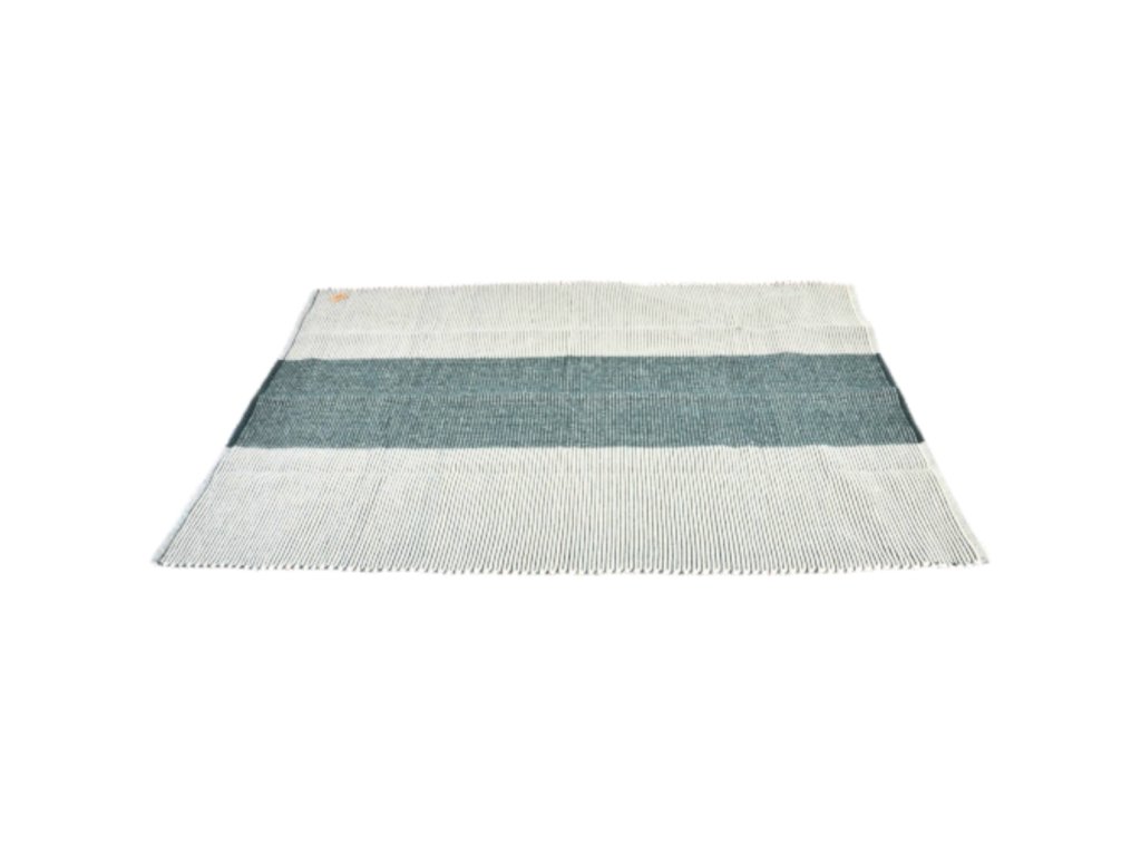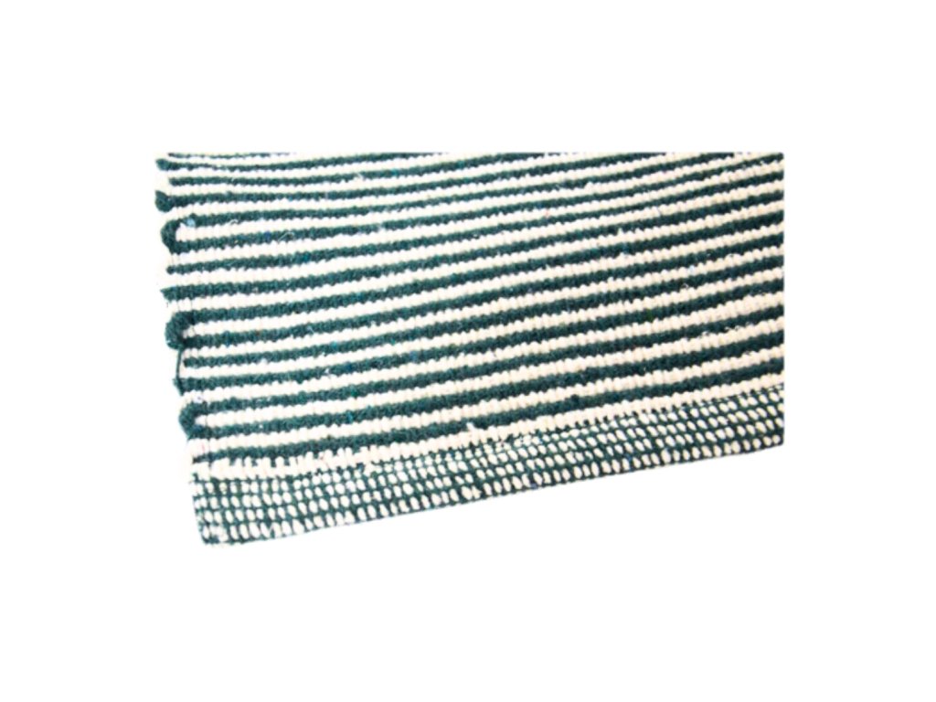Szőnyeg ESQUINA zöld és fehér színkombinációban stílusos és fenntartható kiegészítő minden otthon számára. A újrahasznosított pamutból készült, így kíméli a környezetet, és kellemes tapintású. Egyszerű, de ötletes kialakítása, melyet kifejező középső sáv a sötétzöld árnyalatban élénkíti a teret anélkül, hogy zavarna.