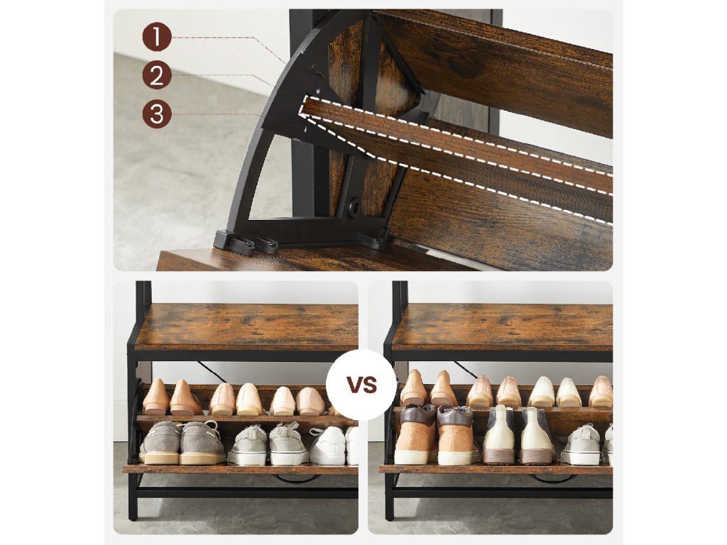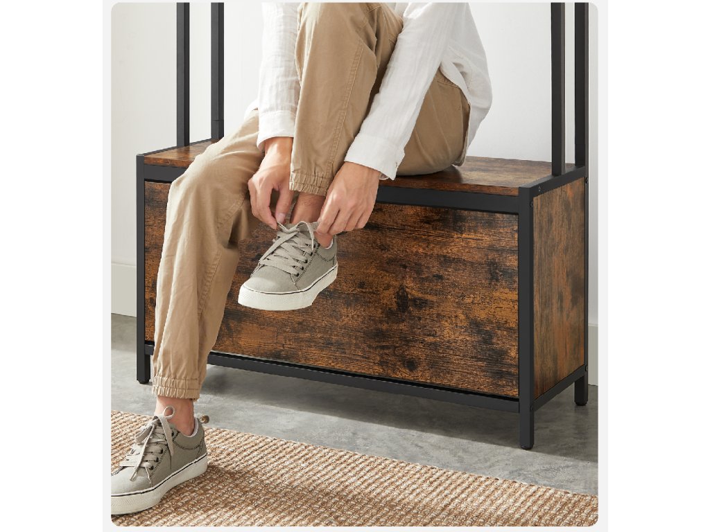 Többé nem kell aggódnia a szétszórt cipők vagy kabátok miatt! Ez a multifunkcionális akasztó paddal és cipősszekrénnyel rendet és stílust hoz az előszobájába. A fém és rusztikus barna forgácslap kombinációja elegáns és modern hatást kelt. A kampók kabátok, táskák vagy hátizsákok felakasztására szolgálnak, a lehajtható cipősszekrény akár két sor cipőt is elrejt, és a felső polc helyet kínál dekorációknak vagy kulcsoknak. A pad elég erős a kényelmes üléshez cipőfelvétel közben. Remek választás mindenkinek, aki értékeli a praktikusságot a dizájnos kialakításban.