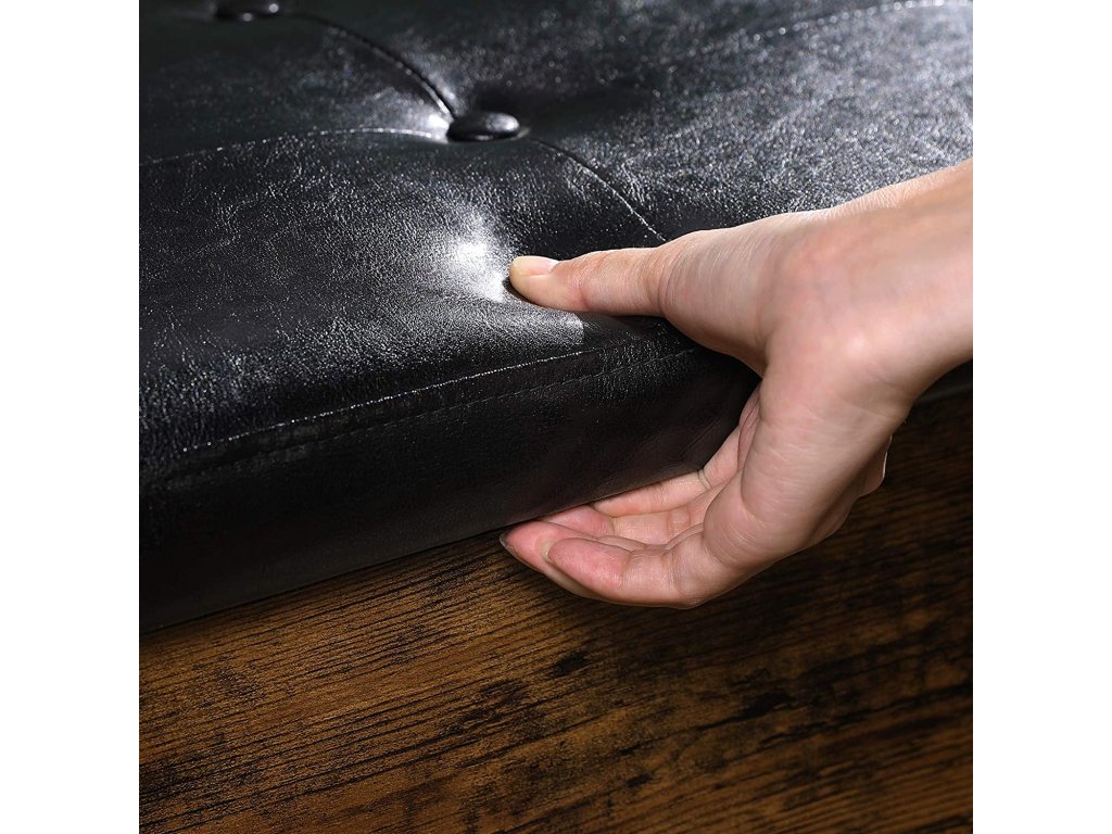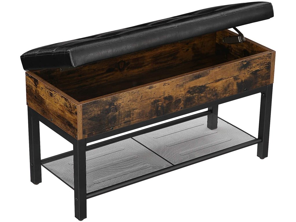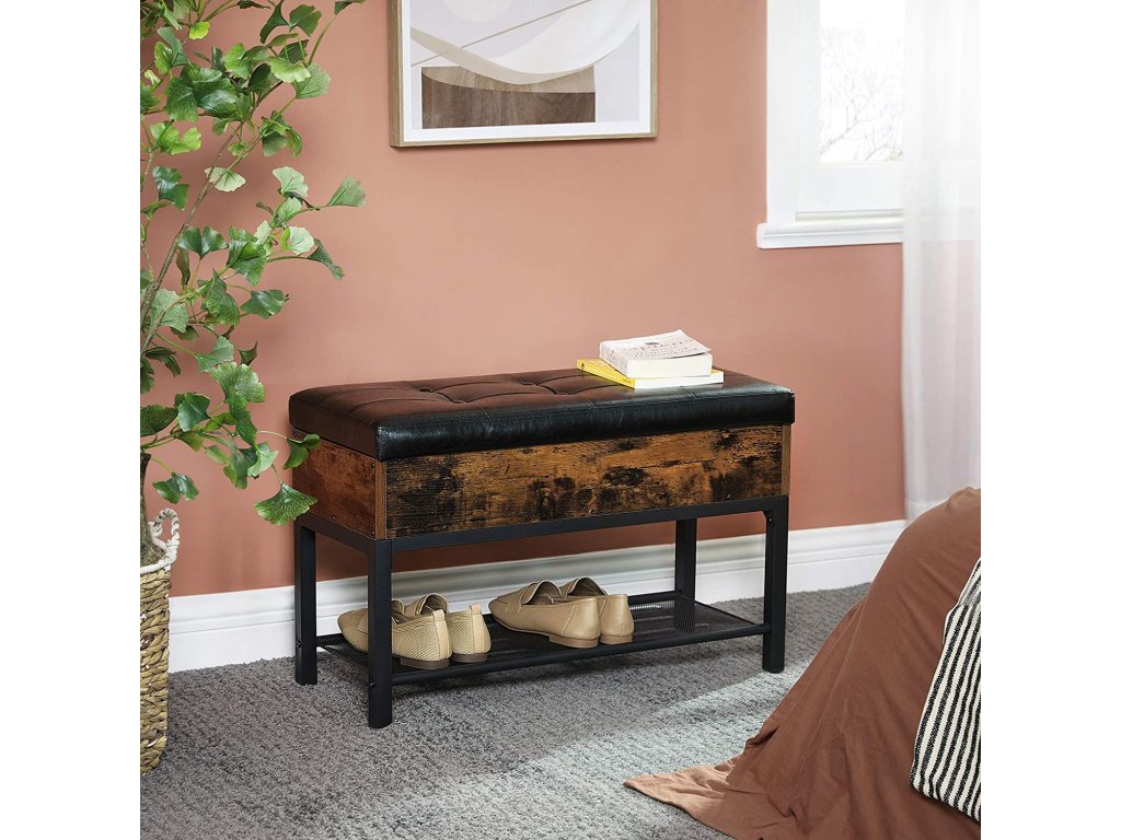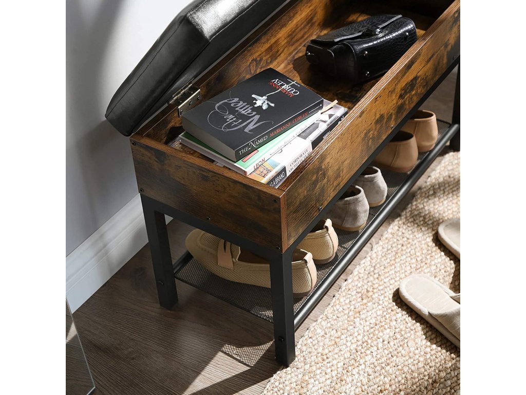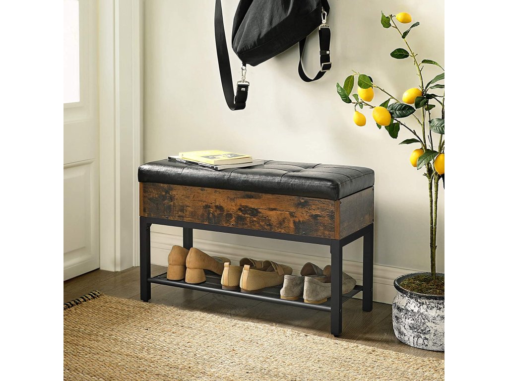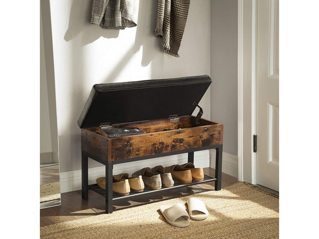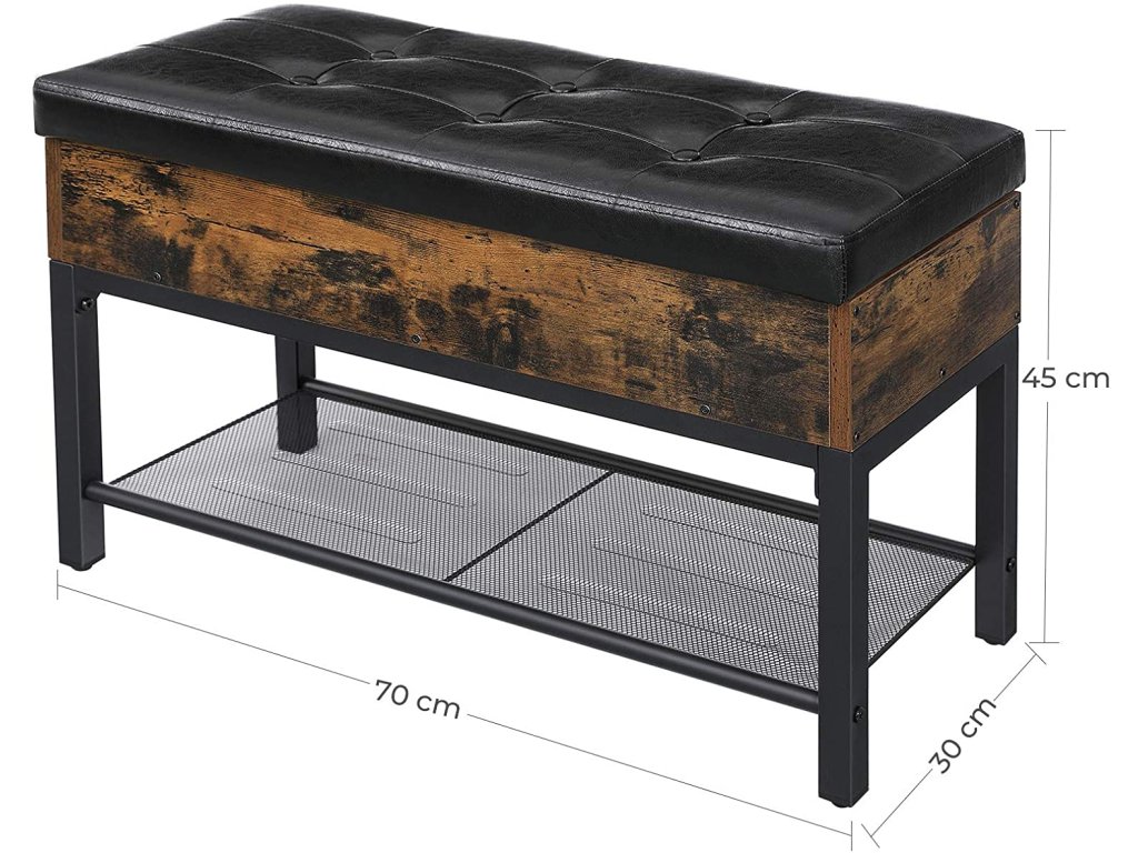 Ez a praktikus előszobai pad egyesíti a kényelmes ülést, a megfelelő tárolóhelyet és a stílusos dizájnt. A felnyitható ülés alatt rejtett tér található apróságok tárolására, míg az alsó rácsos polc néhány pár cipő számára biztosít helyet. A rusztikus farostlemez, a fekete fém és a párnázott ülőke kombinációja ipari eleganciát kölcsönöz az enteriőrnek. Ideális megoldás mindenki számára, aki funkcionális és elegáns bútort keres az előszobába.