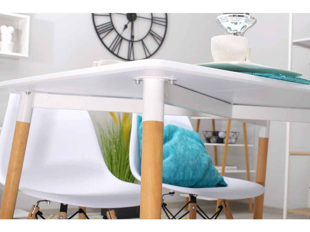 A fehér szín, a természetes bükkfa lábak és a tiszta vonalak ideális kombinációt alkotnak a modern és a klasszikus belső terek számára is. Ez az étkezőgarnitúra nemcsak esztétikailag hatásos, de funkcionálisan is a mindennapi használatra lett tervezve. A székek puha, eko bőr ülőfelülete kényelmet és stílust kínál, míg a stabil, fémmel megerősített asztal minden családi összejövetelen helytáll. Élvezze a kényelmet, amely egyszerűségével tündököl, és egészítse ki a teret praktikus kiegészítőkkel, mint például ülőpárnákkal vagy díszbokrokkal.
