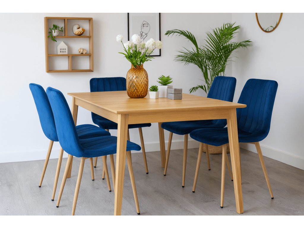 A stílus, amely egyszerű formákat és magas funkcionalitást ötvöz. Válasszon visszafogott kiegészítőket, lágy színpalettát és természetes anyagokat. Skandináv étkező nagyszerű kiegészítői a örökzöld növények, színes teríték és nagy fém lámpák. A skandináv enteriőr nem nélkülözheti a nagy ablakokat és világítást, mely biztosítja a fényt rövid napokon is. A Kék bársony szék LAVA tökéletesen illeszkedik a skandináv országok által inspirált étkezőbe. Egyszerű varrás és fém lábak fa dekorral harmonizálnak az asztallal, amelyen fém elemek vannak. Kiválóan mutatnak különféle színű székek egy asztal körül. Ne féljen a változástól.