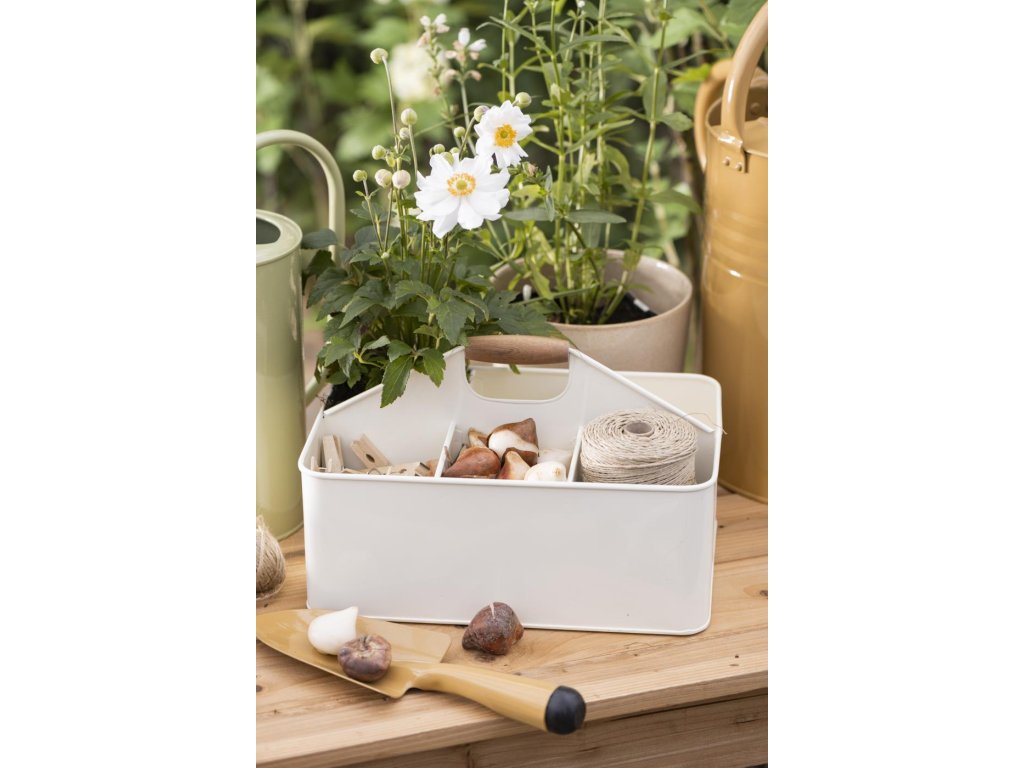 Ez a fém rendszerező ideális megoldás mindazoknak, akik szeretik a praktikusság és a szép kialakítás kombinációját. Remekül illik fűszernövények, szerszámok, kreatív eszközök tárolására, vagy dekorációként a teraszon. A hat különálló rekesznek és a masszív fa fogantyúnak köszönhetően minden a helyén lesz, mégis kéznél marad. Stílusos segédeszköz, amely minden otthonban és kertben megtalálja a helyét.