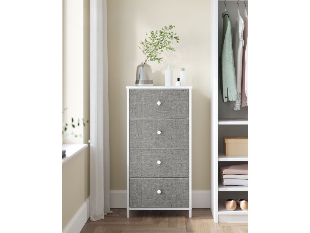 Ez a stílusos komód szürke textíliával és fehér szerkezettel ideális megoldás a mindennapi szervezéshez. Akár a hálószobába alsóneműk számára, akár az előszobába kiegészítőknek vagy a gyerekszobába játékoknak helyezi, mindig elég teret biztosít 4 tágas fiókjának köszönhetően. Könnyű szerkezete miatt könnyen mozgatható, ugyanakkor stabil marad a merevítéseknek és a falhoz való rögzíthetőségnek köszönhetően. Elegáns megjelenése és praktikus felhasználása miatt ideális választás minden otthon számára.