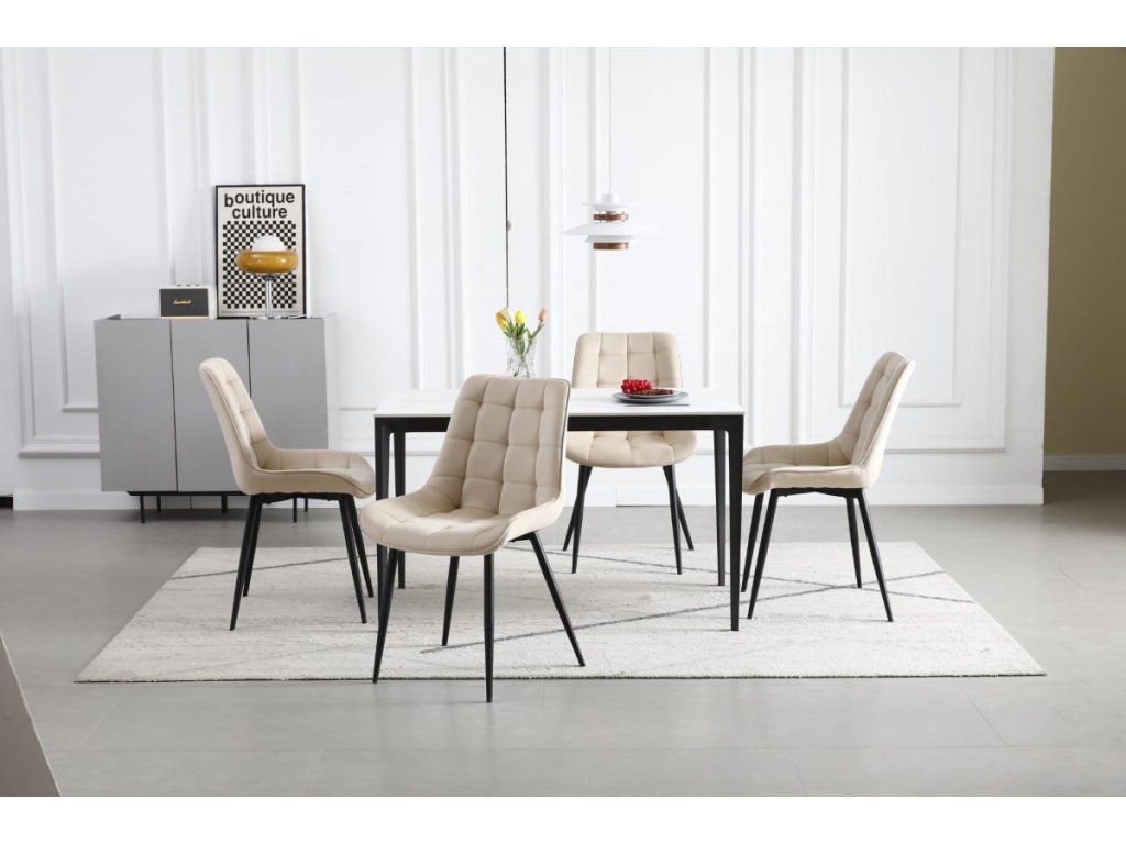 A stílus egyszerű formákat és magas funkcionalitást ötvöz. Fogadjon visszafogott kiegészítőkre, finom színpalettára és természetes anyagokra. Kiváló kiegészítők a skandináv étkezőhöz az örökzöld növények, színes terítékek és nagy fém lámpák. A skandináv belső tér elengedhetetlen tartozékai a nagy ablakok és a világítás, amelyek világosságot biztosítanak a rövid napokon is. A Bézs étkezőszék BERA tökéletesen illeszkedik a skandináv országok által inspirált ebédlőbe. Egyszerű steppelés és fekete lábak harmonizálnak a fém elemekkel ellátott asztallal. Kiválóan mutatnak az eltérő színű székek egy asztalnál. Ne féljen a változástól.