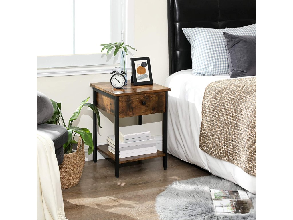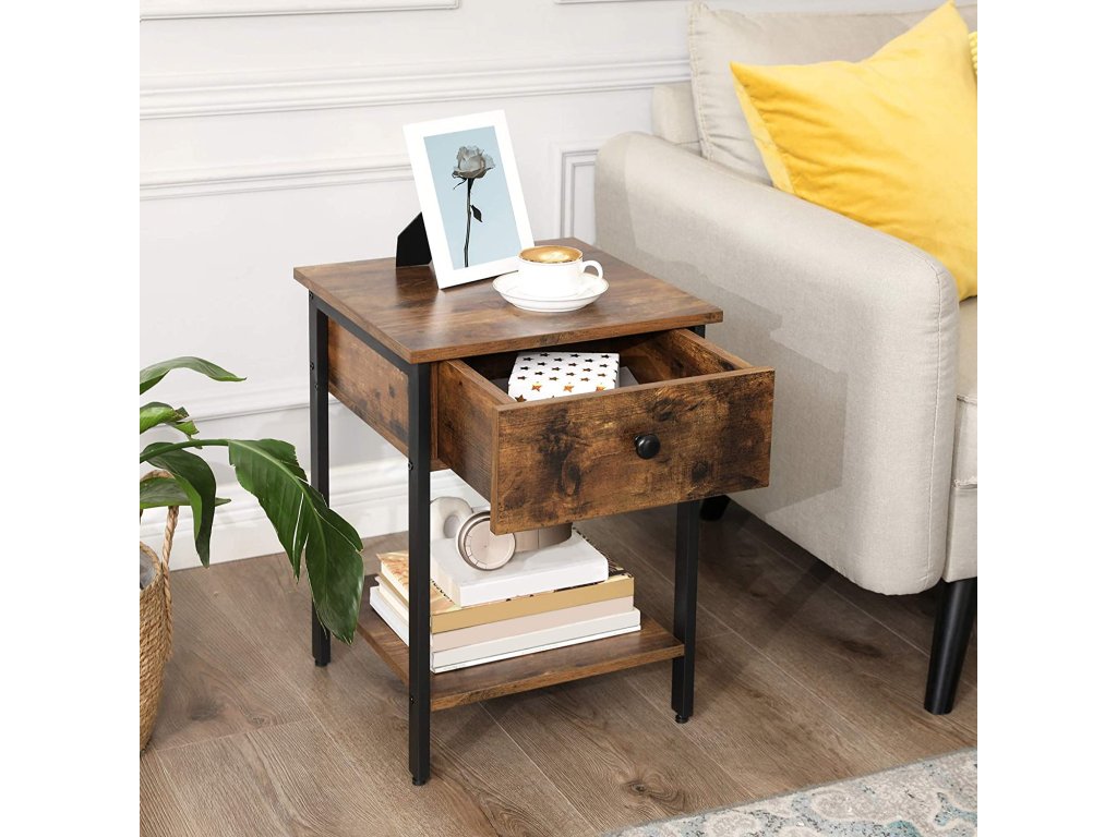 Ez a praktikus kis asztalka mély fiókkal és nyitott polccal kínálja a stílus és funkcionalitás ideális kombinációját. Remekül szolgál éjjeliszekrényként a hálószobában vagy tároló asztalként a kanapé mellett, ahol helyet biztosít egy lámpának, könyvnek és teáscsészének. A fiók kisebb tárgyakat fogad, amelyeket kéznél szeretne tartani, de ugyanakkor elrejthető. Az időtlen ipari design rusztikus barna színben könnyen beilleszthető különböző típusú enteriőrökbe, és otthonos jelleget kölcsönöz nekik.