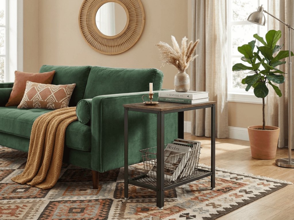 Kompakt formájának és praktikus kialakításának köszönhetően ez az asztal elengedhetetlen társává válik minden helyiségben. Ideális helyet kínál egy könyv, kávéspohár vagy dekoráció elhelyezésére, míg az alsó fém polcok átlátható tárolást biztosítanak magazinoknak, kosaraknak vagy elektronikának. A fa és fém kombinációja indusztriális jelleget kölcsönöz a belső térnek, ugyanakkor könnyen illeszkedik a különböző berendezési stílusokhoz. Használja az asztalt a kanapé mellett, az előszobában vagy éjjeliszekrényként – a lehetőségek száma végtelen.