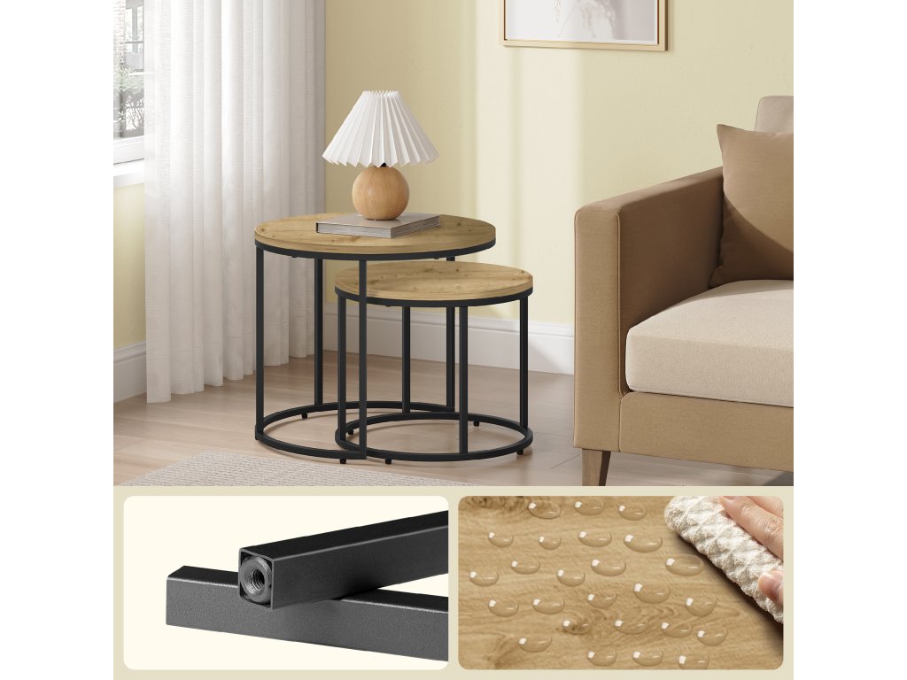 Ezek az asztalok tökéletesen alkalmasak éjjeli szekrényként a hálószobában, elegendő helyet biztosítva lámpának, könyveknek vagy ébresztőórának. A nappaliban stílusos dohányzóasztalokként szolgálnak kávé, dekorációk vagy magazinok elhelyezésére. Modern kialakításuknak és kompakt méreteiknek köszönhetően könnyen alkalmazkodnak a kisebb terekhez is, mint például az balkonok vagy teraszok, ahol hangulatos pihenőhelyet teremtenek. A fa és fém kombinációja elegáns és korszerű megjelenést kölcsönöz otthonának.
