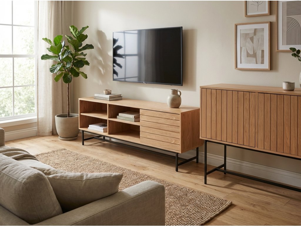 Ez a TV állvány ideális megoldás a modern nappali számára, ahol a tiszta megjelenés és funkcionalitás a legfontosabb. Elegendő helyet kínál elektronikának és kisebb kiegészítőknek, melyek az átgondolt elrendezésnek köszönhetően áttekinthetően tárolhatók. A kábelnyílások segítenek a televízió környezetének rendezett és zavaró tényezőktől mentes tartásában. A tölgy dekor természetes hatása a fémváz szerkezettel időtálló megjelenést biztosít, és könnyedén illeszkedik a különböző belső stílusokhoz, legyen szó modern, ipari vagy skandináv megjelenésről.